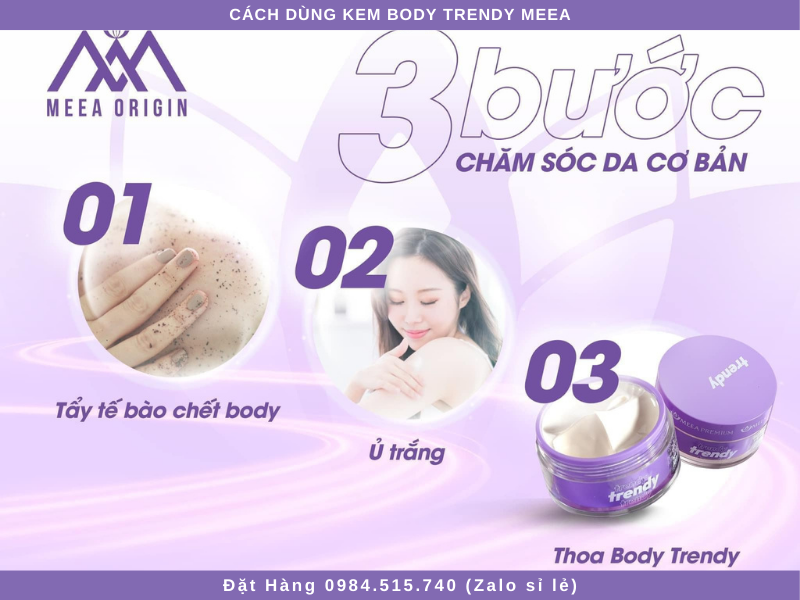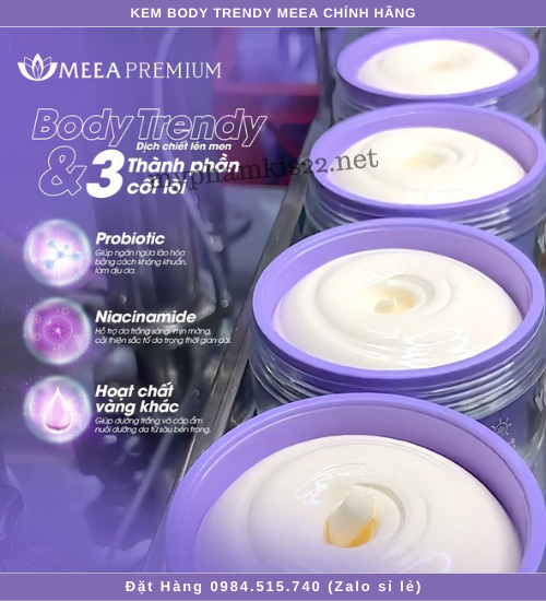 Kem body trendy meea dịch chiết lên men có tốt không Kem body trendy Meea dịch chiết lên men với thành phần chính Probiotic, Niacinamide giúp dưỡng trắng da vượt trội, chống nắng an toàn, Dưỡng ẩm, bỏ vệ da, ức chế săc tố melamin, tăng cường độ đàn hồi cho da.