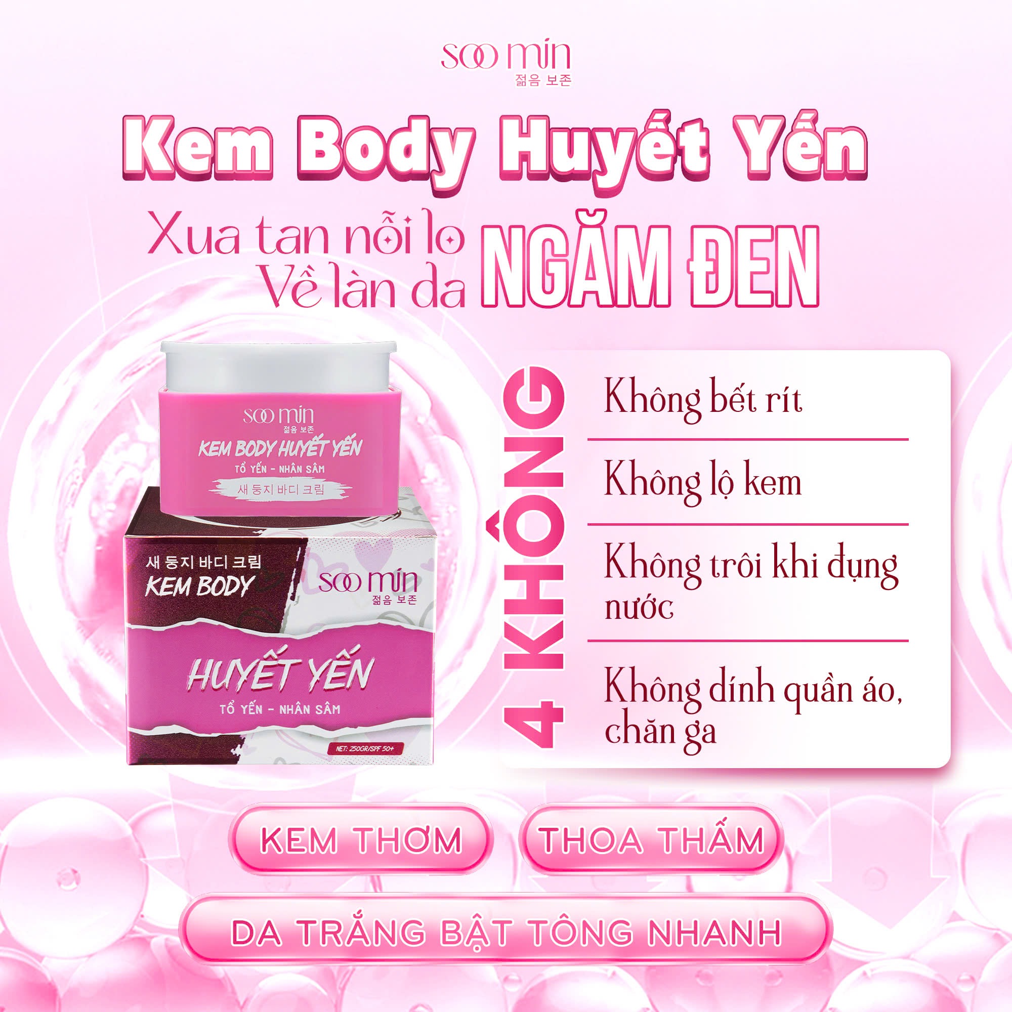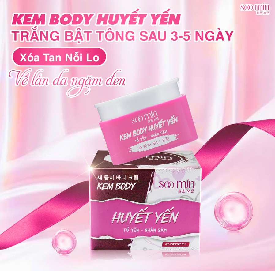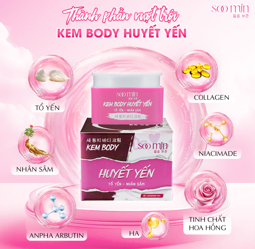 Nếu bạn đang tìm một sản phẩm vừa giúp dưỡng trắng da, vừa cấp ẩm toàn thân, mờ thâm sạm, lại kèm khả năng tái tạo da lâu dài, thì Kem dưỡng Body Huyết Yến Soo Min chính là lựa chọn lý tưởng.