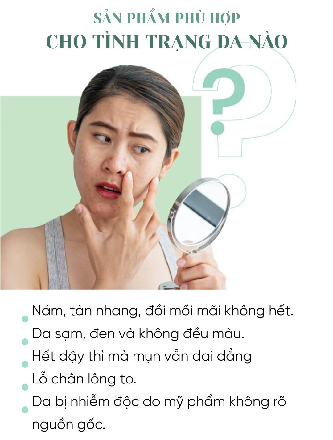 - Người điều trị nám, thời gian sử dụng sản phẩm sẽ nhanh đạt được hiệu quả làn da mong muốn như đều màu, săn chắc, sáng mịn da, sạch mụn...