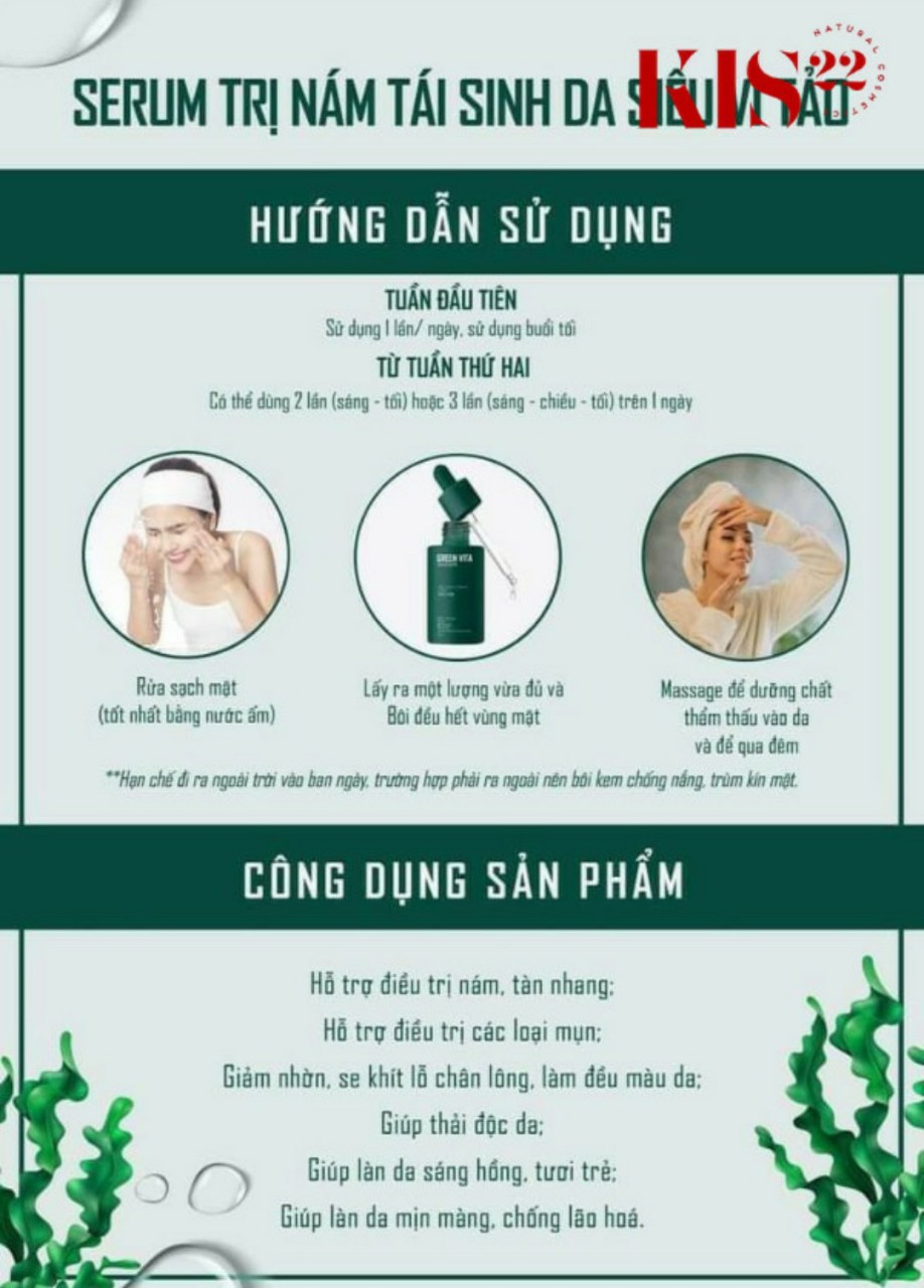 Serum tái tạo VI TẢO KIS22 với công dụng giải quyết dứt điểm các vấn đề tàn nhang, thâm nám, mụn, da sần sùi không đều màu. Với phương pháp đơn giản nhưng hiệu quả thật sự. Có nhiều khách hàng khi sử dụng không biết khi nào thì ngưng.